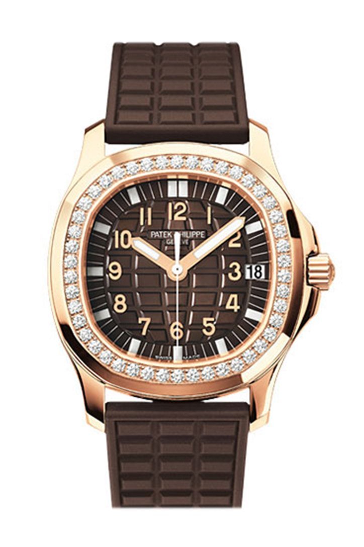 18kt rose gold case case with a brown rubber strap. Fixed 18kt rose gold diamond set bezel. Grey dial with gold-tone hands and Arabic numeral hour markers. Minute markers around the outer rim. Dial Type: Analog. Luminescent hands and markers. Date display at the 3 o'clock position. Calibre 324 S C automatic movement with a 40-hour power reserve. Scratch resistant sapphire crystal. Screw down crown. Transparent case back. Round case shape, case size: 35.6 mm, case thickness: 8.5 mm. Fold over clasp. Bezel: Set with 46 (1 ct.) Diamonds Water resistant at 120 meters / 400 feet. Functions: hours, minutes, seconds, date. Luxury watch style. Watch label: Swiss Made. Aquanaut Luce Automatic Diamond Grey Dial Ladies Watch 5068R.