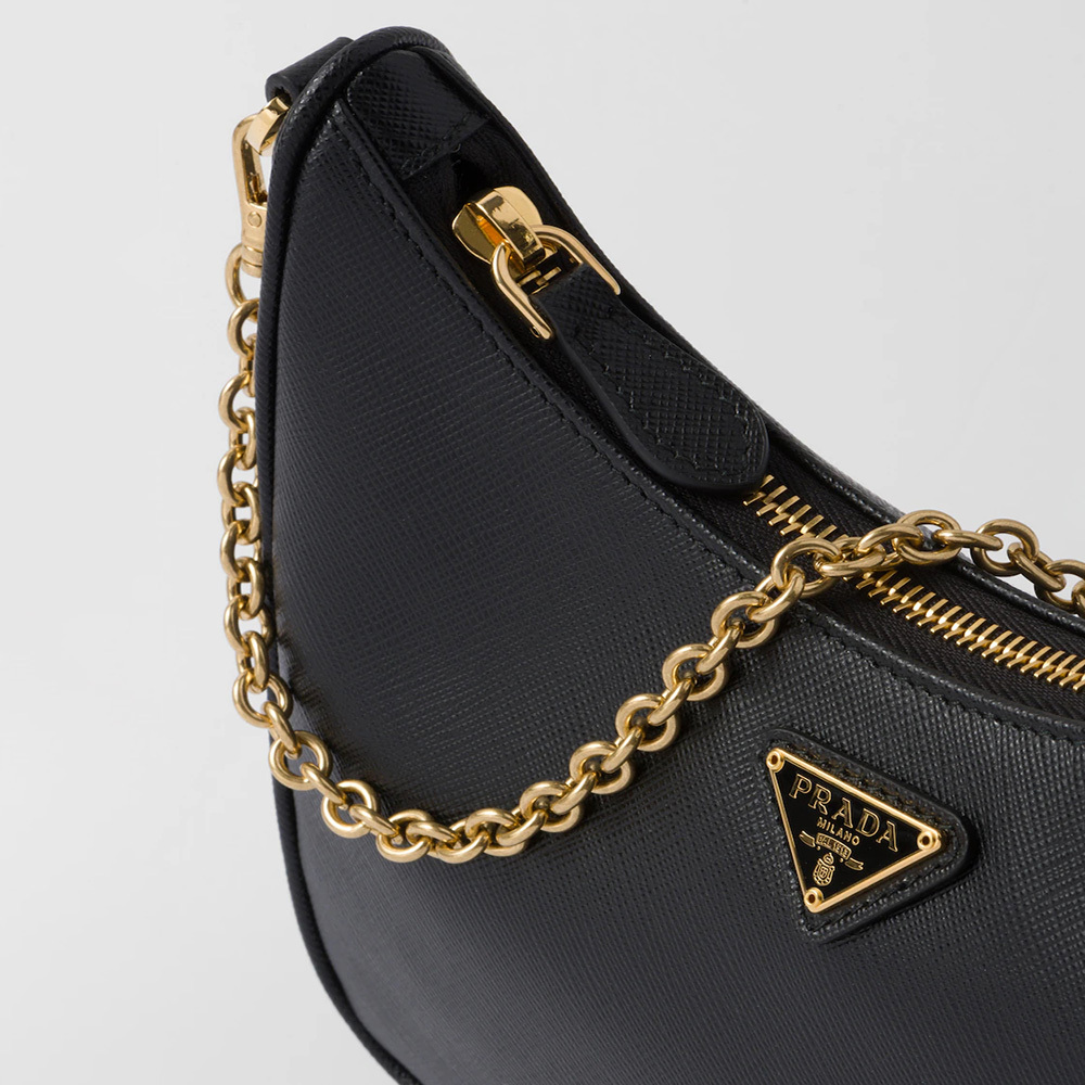 An iconic silhouette with sophisticated details that enhance the design: Prthtada transforms the classic shoulder bag, reinterpreting it in Saffiano leather with a cross-hatch motif that is a hallmark of the brand. The accessory is completed by a removable leather pouch and Re-Edition keychain, making the bag unique and functional.
