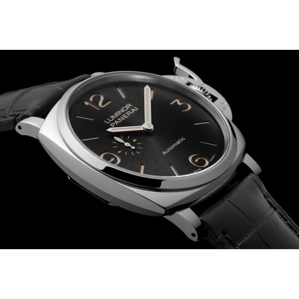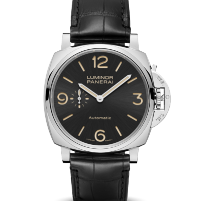 Unworn Men’s Watch Luminor Due - 47mm, AISI 316L stainless steel case. Black Sun-brushed "Sandwich" construction dial with cutout indications and luminous backing. Polished hands with vintage-colored luminous fill. Vintage colored luminous large Arabic numerals in the 3, 6, 9, 12 o’clock position with and Index hour markers. Small seconds sub-dial located at the 9 o'clock position, with blued hand and luminous indexes. Date display at the 3 o'clock position. The dial protects Scratch-resistant Sapphire Crystal. 's (protected as a trademark) instantly recognizable crown protector and screws down the crown of polished steel. The watch is a shaped Cushion case and has a See-through case back of the sapphire crystal. Fixed polished steel bezel. Automatic mechanical movement in-house Caliber P.4000 contains 31 Jewels and has an approximate 3-day (72-hour) power reserve. The watch presented on a Black Alligator Strap with Tone on tone Stitching and secured by a stainless steel Tang Buckle Clasp. The water resistance is up to 30m/100ft.